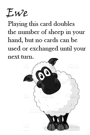 2 Ewe Cards Playing this card doubles the number of sheep in your hand, once played, no cards can be used or exchanged by you until your next turn. | |