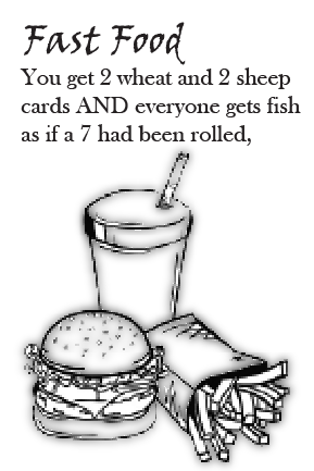 4 Fast Food Cards Everyone gets fish as if a 7 had been rolled, and you may draw 1 wheat and 1 sheep card. |