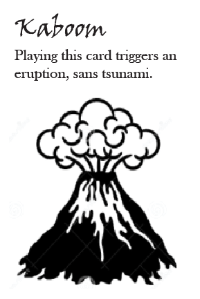 4 Kaboom Cards A volcanic eruption is triggered as if a 12 were rolled. All ships must leave port to an adjacent sea hex. Roll one die for direction of flow. | |