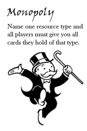 4 Monopoly Cards Name one resource type and all players must give you all the cards they hold of that type. | |