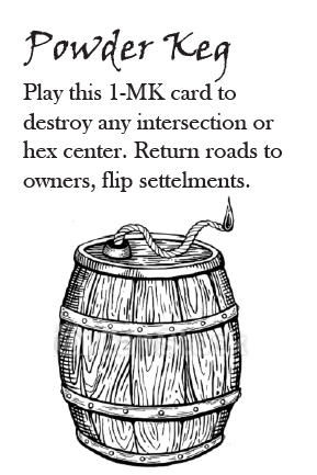 4 Powder Keg Cards Play this attack card to destroy any intersection, flip over settlement and return roads to owners. Anyone may build here; the previous owner may do so, from scratch, without roads. | |