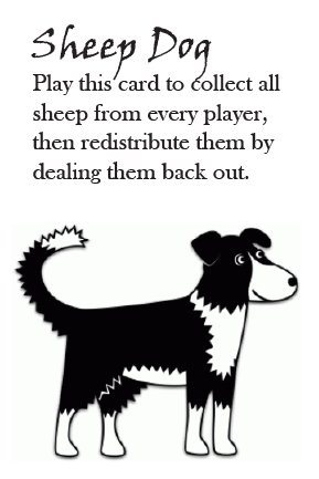 2 Sheep Dog Cards Collect all sheep from all players and deal them back out evenly, keeping any extras for yourself. | |