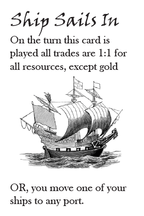 2 Ship-Sails-In Cards On this turn you may trade 1:1 any resource except gold. AND Gold may be traded for 1:2, one gold gets 2 of anything else. AND you may move one of your ships to any port. | |