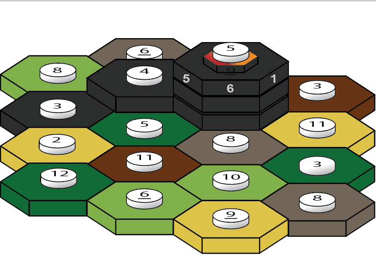 Board SetupThe Big Island has 36 hexagonal tiles: 9 across and 5 sea tiles one each side. There is a volcano instead of a desert, and river tiles are optional. OR
