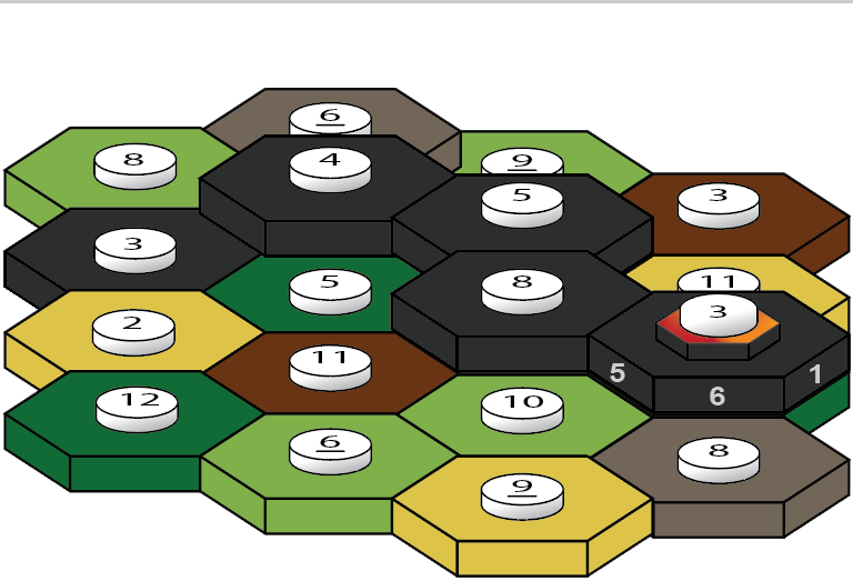 | Build on the edges of a terrestrial hex, roads are used to expand. New settlements must be 2 roads apart. New roads can only be placed adjacent to an existing settlement, or to another of your roads | ||||||||