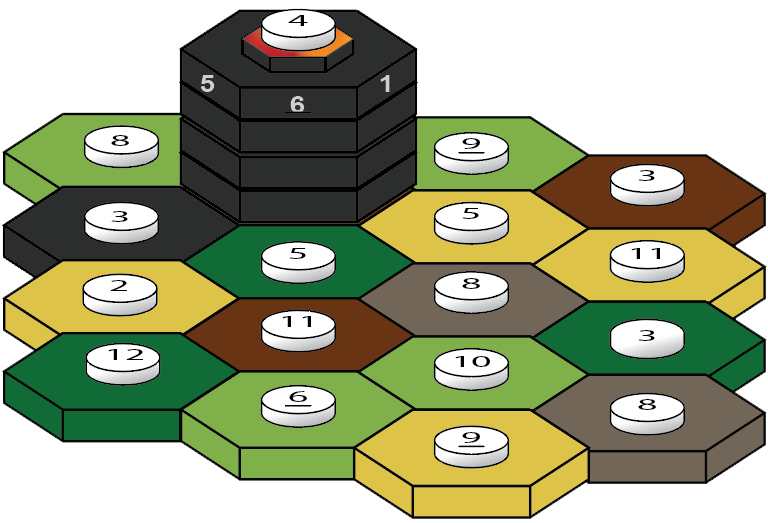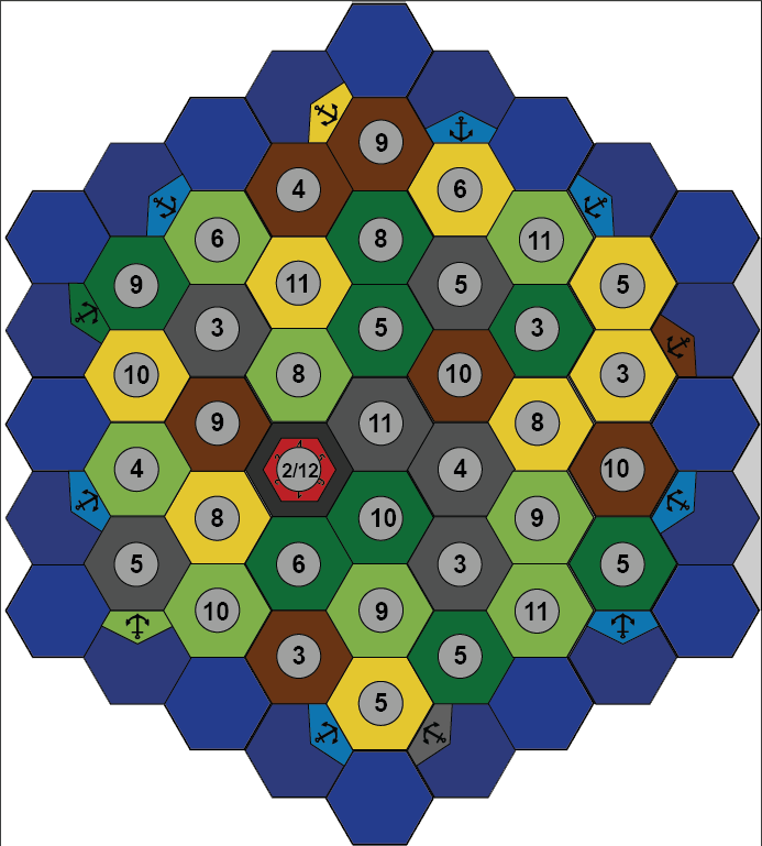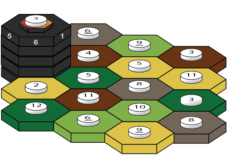 Board SetupThe Big Island has 36 hexagonal tiles: 9 across and 5 sea tiles one each side. There is a volcano instead of a desert, and river tiles are optional. OR