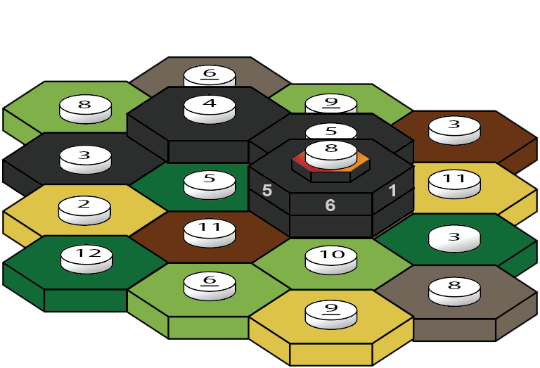 | Build on the edges of a terrestrial hex, roads are used to expand. New settlements must be 2 roads apart. New roads can only be placed adjacent to an existing settlement, or to another of your roads | ||||||||